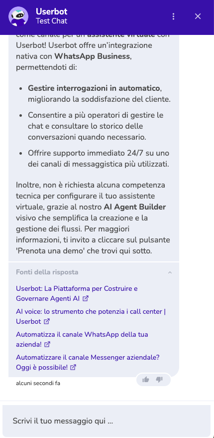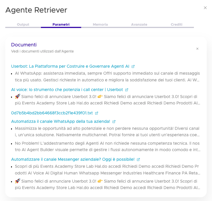 Nella nostra piattaforma, infatti, è possibile mostrare sia sulla chat di conversazione che nella parte di analisi, quali sono le fonti utilizzate dall’agente per rispondere e i singoli chunk recuperati dal RAG.