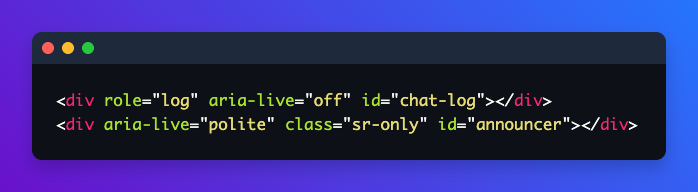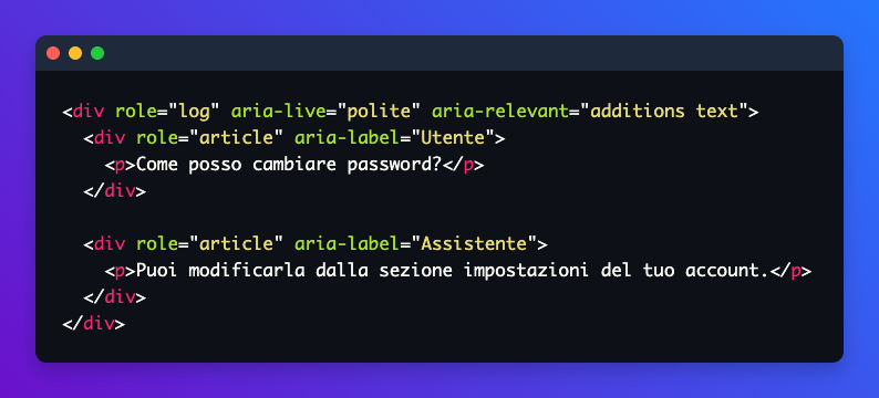 La soluzione è modellare la chat come una timeline semantica: usare pattern come role="log" per comunicare alle tecnologie assistive che il contenuto si evolve nel tempo, e strutturare i blocchi dei messaggi in modo da distinguere chiaramente l’autore, il tipo di contenuto e lo stato. Non stai solo strutturando il DOM per ragioni estetiche, stai definendo una grammatica della conversazione che gli strumenti assistivi possono interpretare.